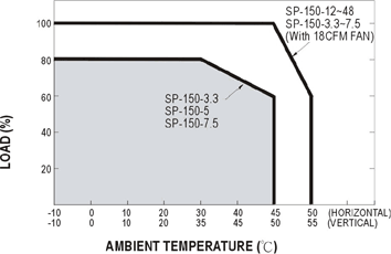 Ex. SP-150产品减额曲线,一般横置/立式的应用环境温度差5°C,而有强制散热/自然散热差20%输出功率。
